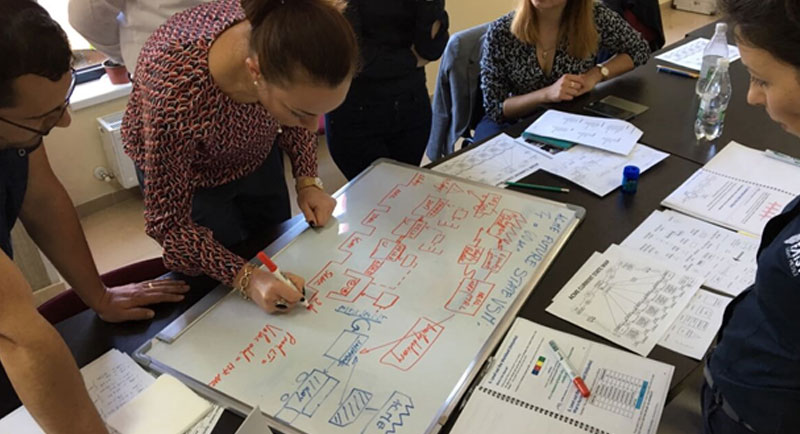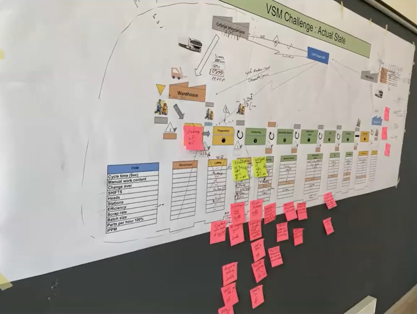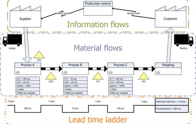 A value stream mapping (VSM) is a lean tool used for process re-engineering. It is made up of three distinct-looking parts: a process map, a corresponding timeline, and the information flow. The process map is comprised of the steps and the information associated with the steps of your process including the amount of time taken by these steps of the process.
